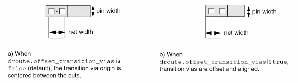 Transition vias are created dynamically, as needed, for tapering between metal layers. When double cut vias are required (minNumCut constraint value is 2), the default via origin is at the center of the cuts. When the droute.offset_transition_vias environment variable is set to true, double cut transition vias will be offset and aligned, as shown in the following figure.