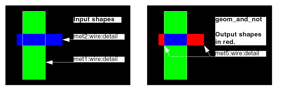 The following example generates new shapes on the met5:wire:detail layer purpose that exist on met2 and do not overlap shapes on met1 wire:detail layer purposes.