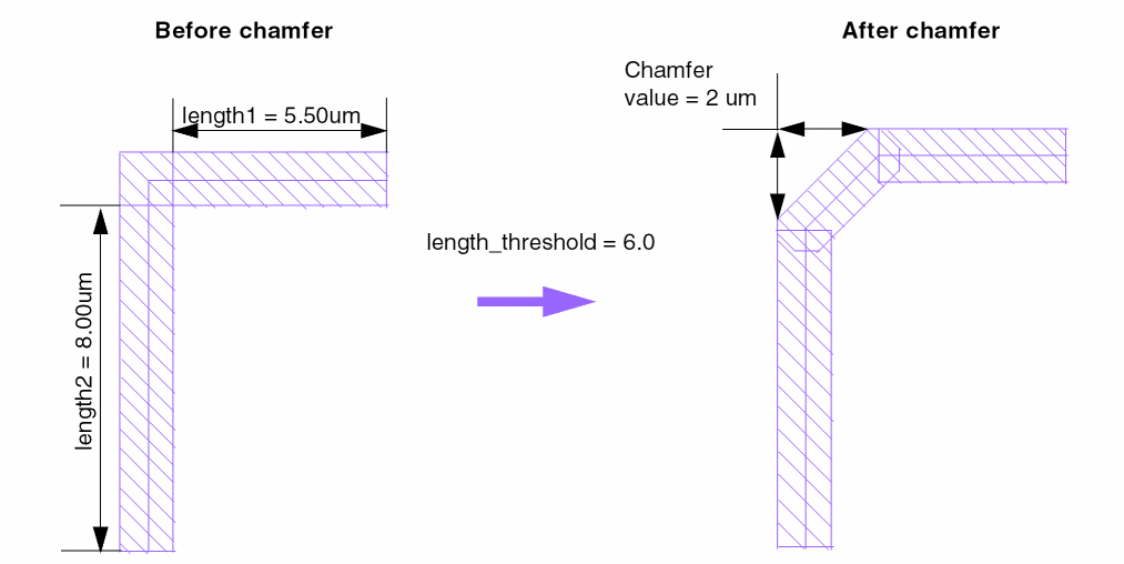 In the following figure, a wire chamfer of 2 microns is created on the inner side of the wire, because the lengths of both segments (5.5 and 8 microns) are greater than length_threshold (5 microns).