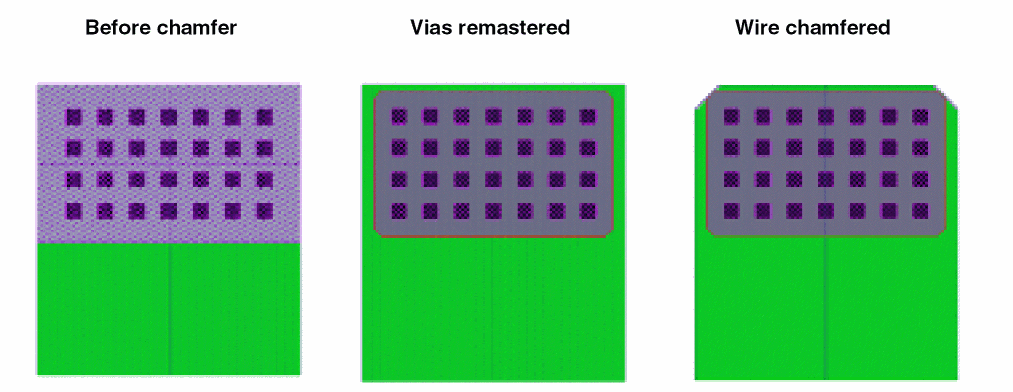 create_chamfer_wire -all -layer M2 -length_threshold 6.0 -chamfer_value1 {2.5 2.0} -chamfer_value2 {3.5 3.0} -chamfer_end_of_stripe true