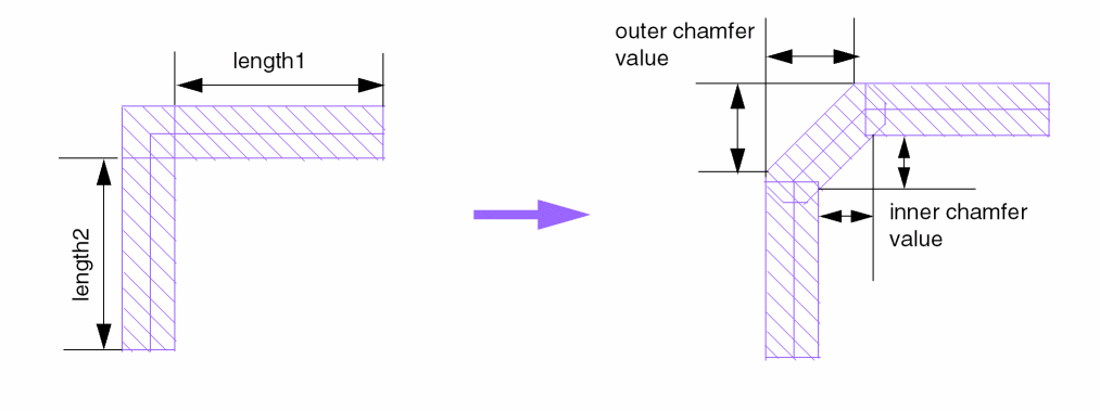Creates chamfer on wires (pathSegs). The wire chamfer mechanism replaces 90-degree wires with 45-degree wires. An example of a wire chamfer is shown in the following figure.