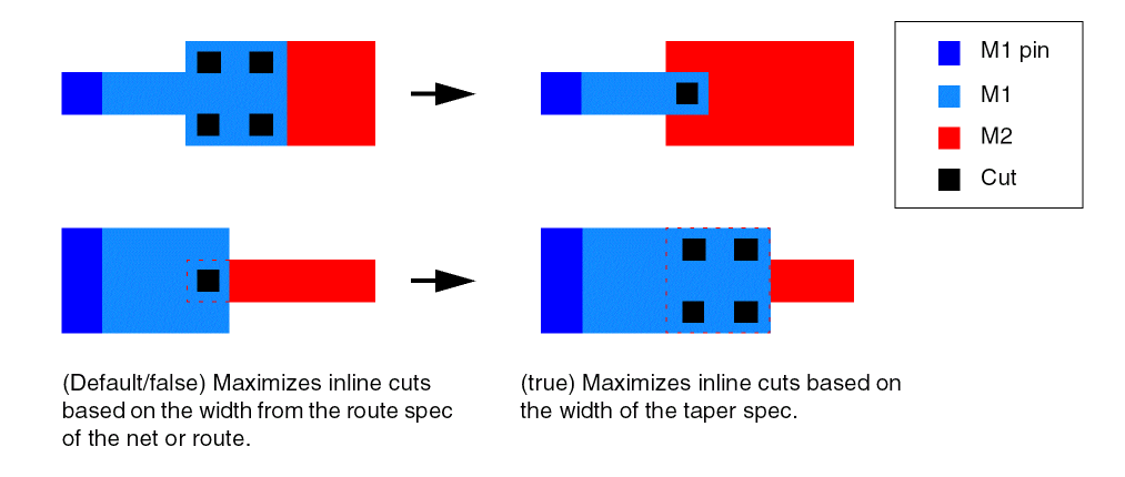 When set to true, maximizes cuts based on the width of the taper route spec when a taper wire connects to a via or via stack and the next wire is oriented in the same direction as the taper wire. When set to false, cuts are maximized based on the width of the route or net route spec.