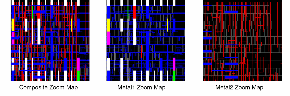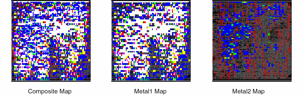The following figures show congestion maps for a design. All layers are represented in the composite map. The other two maps isolate the congestion for Metal1 and Metal2, which are the only layers used for routing signals. The maps show that Metal1 contributes to the majority of the congestion, and areas colored white are the most severely congested.
