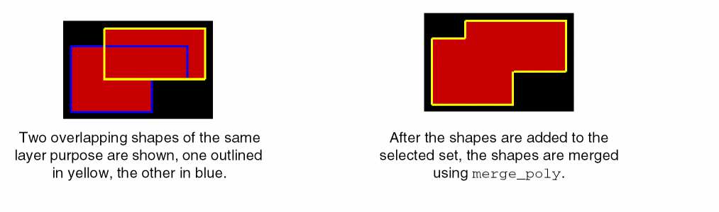 Merges polygon shapes in the given set or the selected set at the top level. Only rectangles, octagons and polygons can be merged. All other shapes in the set are ignored. Shapes which overlap on the same layer purpose pair, and which belong to the same parent (for example, pin or top-level occurrence) are combined into a single geometry. If the combined geometry is rectangular, the original shapes are replaced with a rectangle shape under the same parent. If not, the original shapes are replaced with a polygon under the same parent. All-angle objects are merged to 45-degree edges when the final polygon is created.
