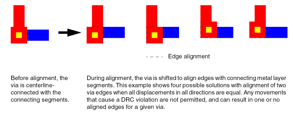 When true, attempts to move vias to align one edge of the via with each connecting segment without creating a DRC violation. If multiple movements are possible, the smallest movement is attempted first. When equal moves are possible, the direction is arbitrarily chosen.