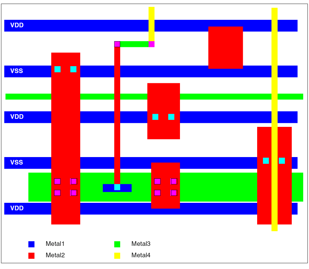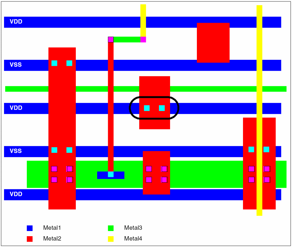 The connections in this example are the same as the previous mesh mode example, with the exception that the Metal2 shape in the center of the figure is connected to VDD. The vias for this shape represent a simple connection that does not affect the IR drop.