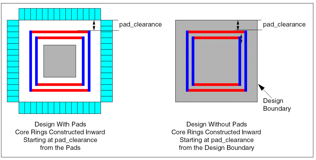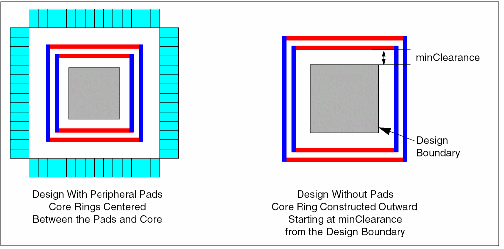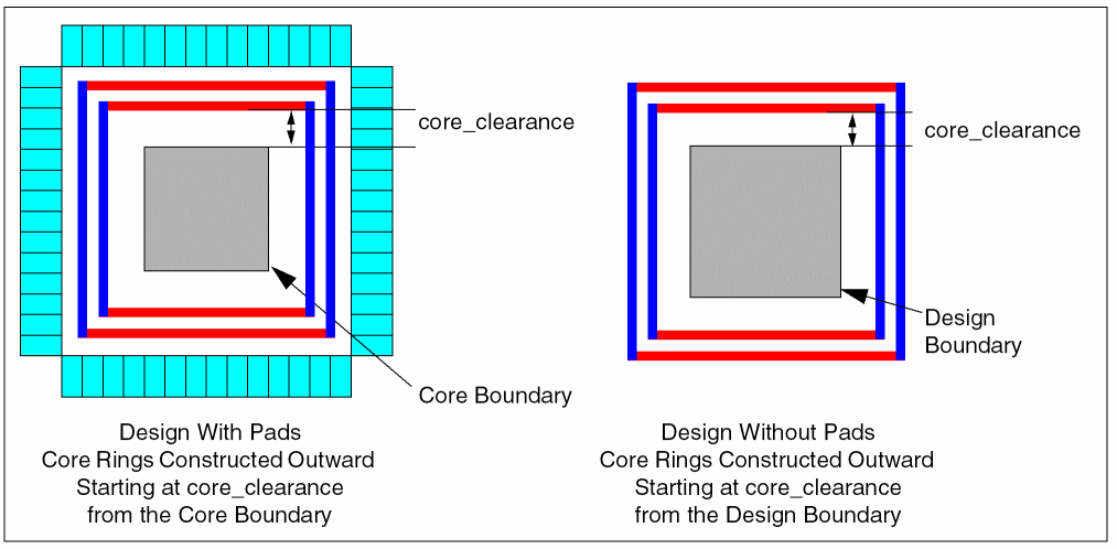 If the design has peripheral pads, the core rings are created outward starting at core_clearance from the core boundary or, if peripheral pads do not exist, the core rings are created outward starting at core_clearance from the design bounds.