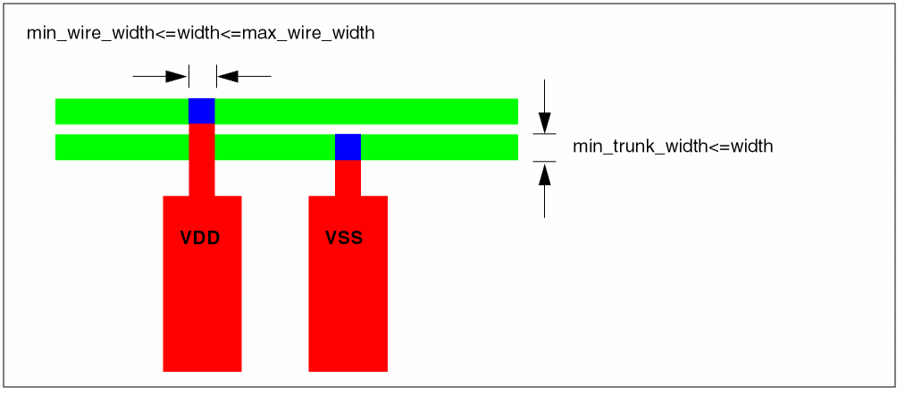 By default, if neither -route_spec nor -min_wire_width -max_wire_width is given, pin-to-trunk connections will be the width of the pin.