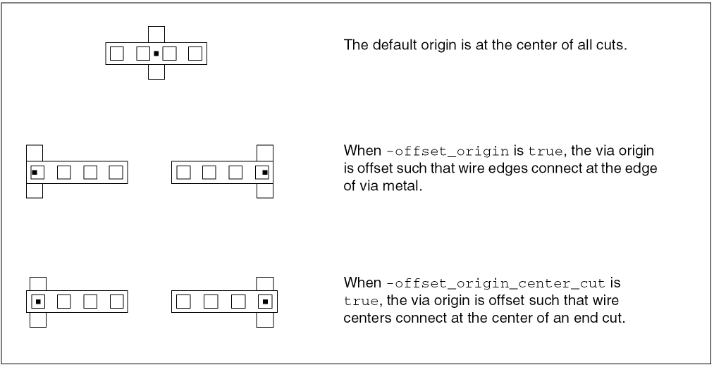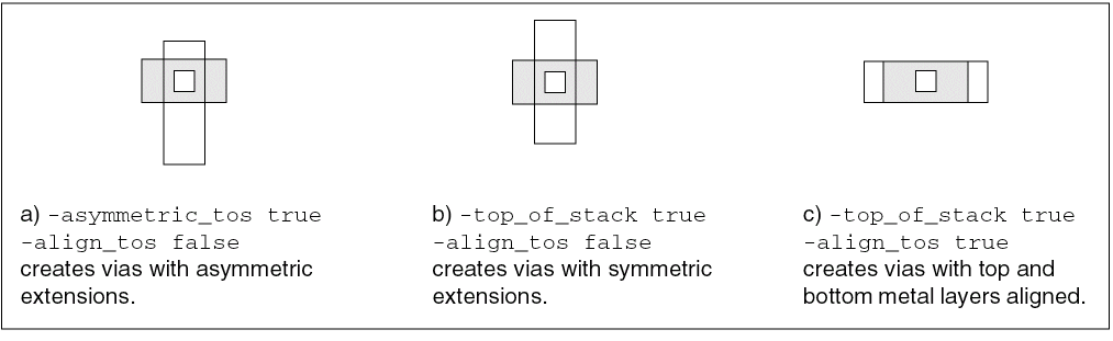 Most of the Boolean arguments determine which via types will be created and default to true. No command arguments are necessary to create these via variations. To eliminate some variations, specify one or more arguments with a false setting, and/or use -use_extension_entry. To create vias from cutClass settings, you must specify a cut class argument (-cut_class or -cut_class_names).