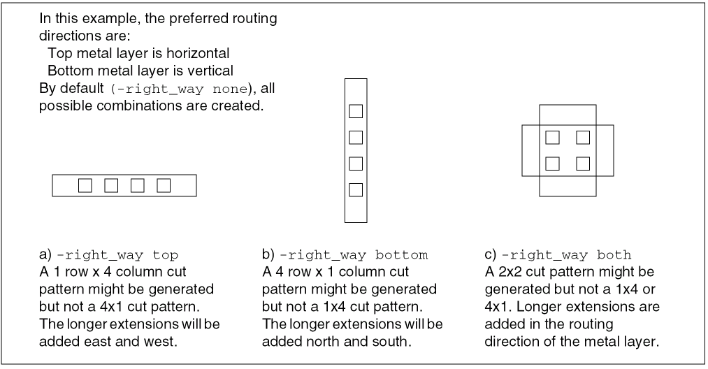 Creates vias with cut pattern and extensions oriented only for right-way metal on top, bottom, both, or none.