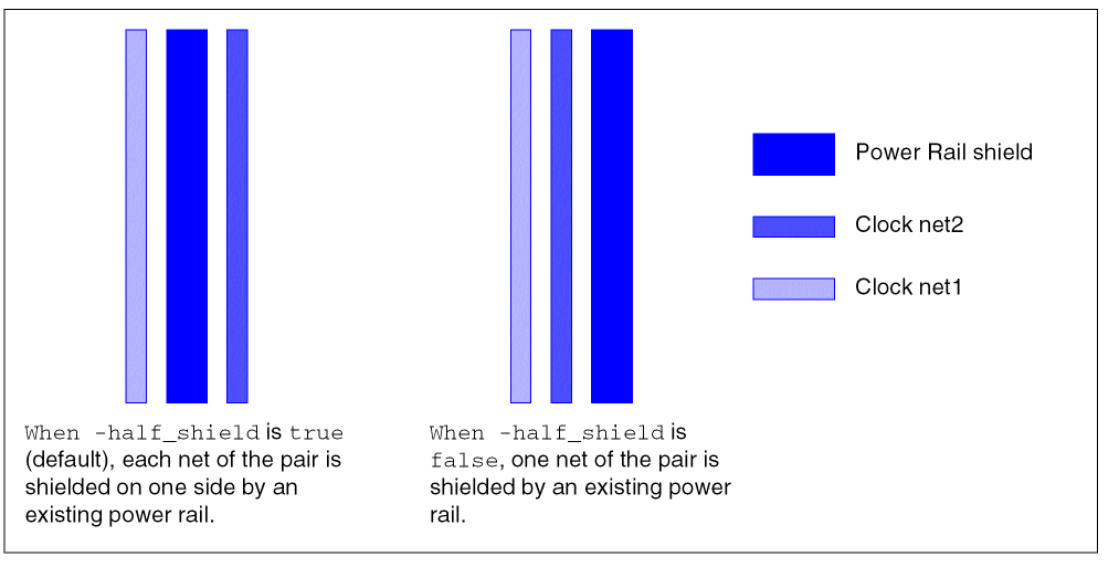 When true, half-shields each net of a given clock pair with an existing power rail. When false, only one net of each clock pair is half-shielded.