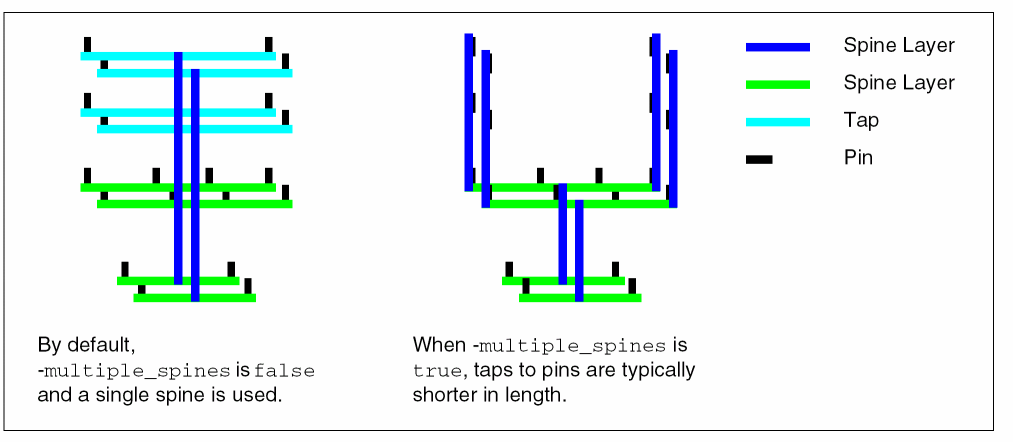 Balances the geometry for clock pairs in a given set (-set), or for a single net pair (-net1 -net2). By default, a single spine is created, but multiple spines can be used (-multiple_spines true).