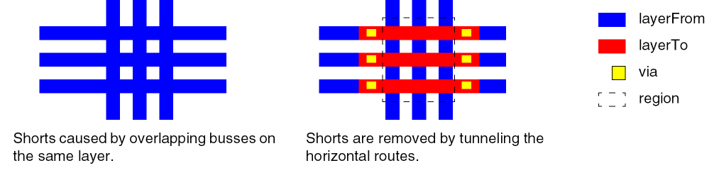 bus_tunnel -set $myNets -region {10 10 20 20} -layerFrom Metal1 -layerTo Metal2 \