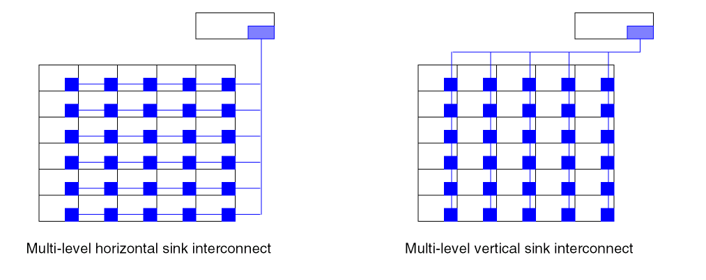 If a net has many sinks in a matrix-type layout of rows and columns, use -multilevel to connect the driver to multiple interconnected sinks. By default, when -multilevel is specified, sinks are connected horizontally in rows. To change this, specify -direction vertical to connect multilevel sinks vertically in columns. The following figure shows examples of a multi-level net star routed horizontally and vertically.