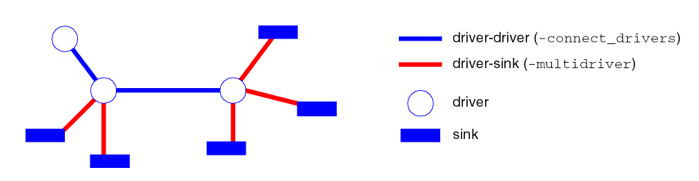 If there are multiple drivers on a net, use -multidriver to connect sinks to the nearest driver and -connect_drivers to connect the drivers to each other. The following figure shows an example of this type of star routing with multiple drivers and sinks. By default, sinks are routed to only one driver on a net.