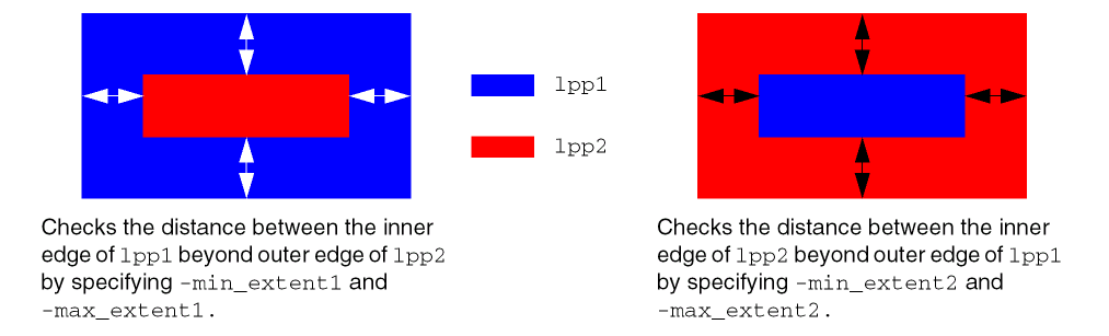 Checks enclosures by measuring the distance between the outside edge of one shape and the inside edge of another shape, or between the outside edge of a shape and the PRBoundary. Specify the appropriate argument for the check that you want to perform (max_extent1, max_extent2, min_extent1, min_extent2, min_bound_extent).
