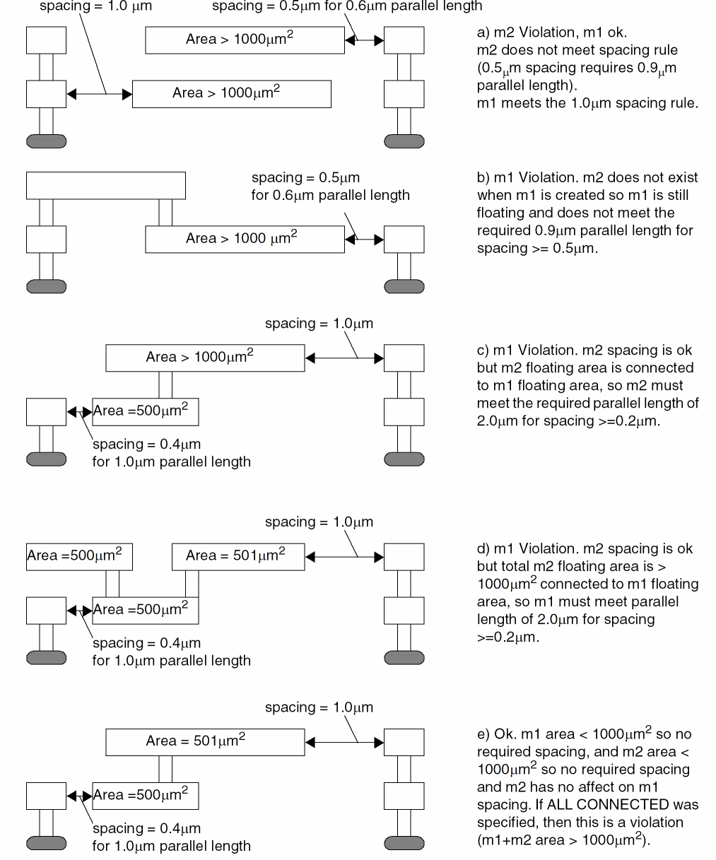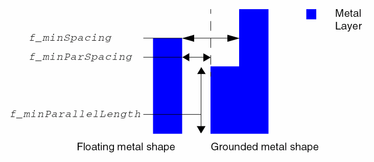 floatingAreaSpacing(LayerDualArrayTblValue) specifies minimum spacing/minimum parallel length pairs by layer. TheLayerDualArrayTblValuesyntax is:{