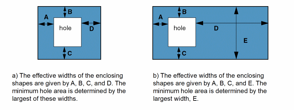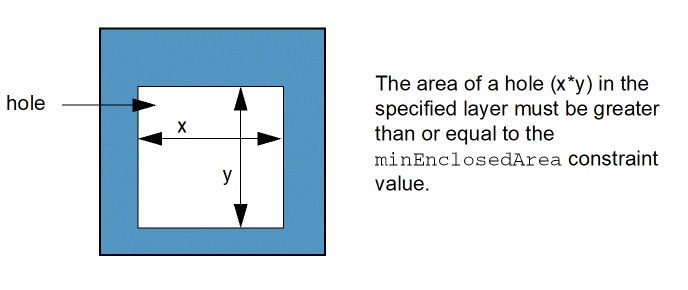 Specifies the minimum area for a hole, or an empty area, that is enclosed by metal. This constraint is often used in conjunction with the minEnclosedSpacing constraint for slotting.