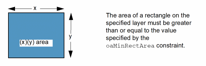 Specifies the minimum area for rectangular shapes on a layer. Optionally, you can also specify a minimum and maximum width for the shape beyond which the constraint does not apply.