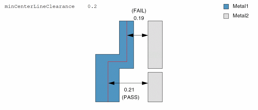 Specifies that the clearance between the Metal2 shape and the centerline (in red) of the Metal1 shape must be greater than or equal to 0.2 user units.