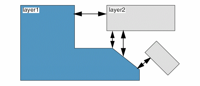 Sets the minimum spacing, edge-to-edge, between shapes on two different layers. This constraint applies only to non-intersecting shapes on the two different layers and ensures that shapes on the two layers do not cross.