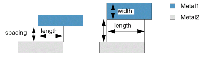 In the following example, the minimum clearance is dependent on the parallel run length between a Metal1 shape and a Metal2 shape. To prevent crosstalk, more spacing is required for longer parallel run lengths. With the row width set to 0, the widths of the shapes are not considered.