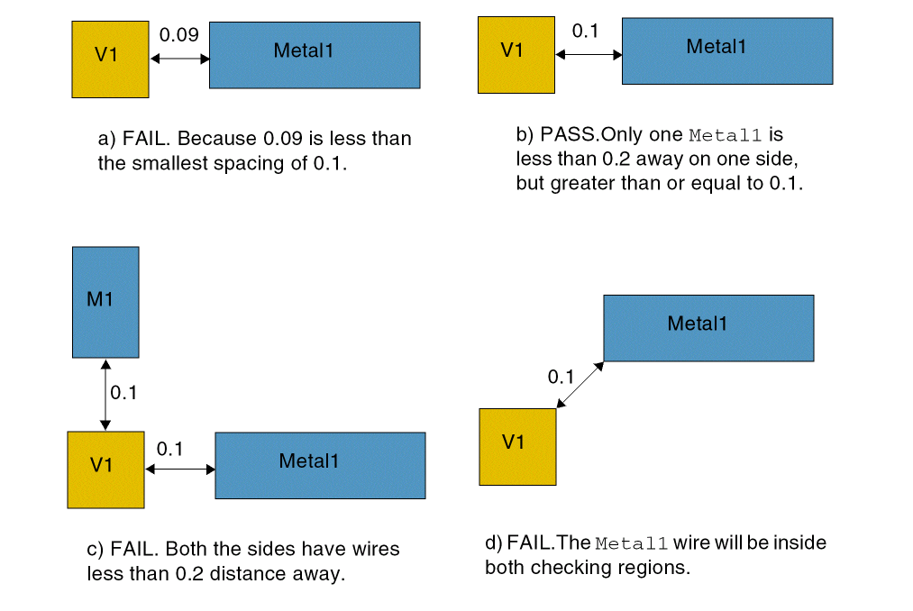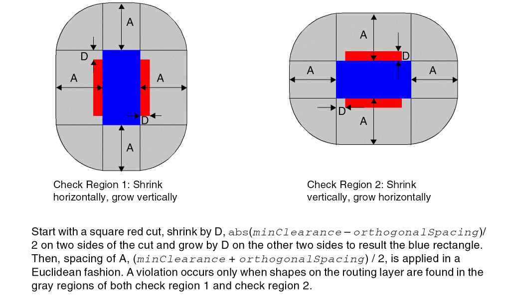 The difference between minClearance and orthogonalSpacing is calculated, and half of that difference is shrunk on two sides of the cut and grown on the other two sides. Then, a Euclidean spacing of the average of minClearance and orthogonalSpacing is applied to the newly formed rectangle geometry. The shrink and grow operations are done on the alternated sides to form another checking region. A violation occurs only when shapes on the routing layer are found in the gray regions of both check 1 and check 2.