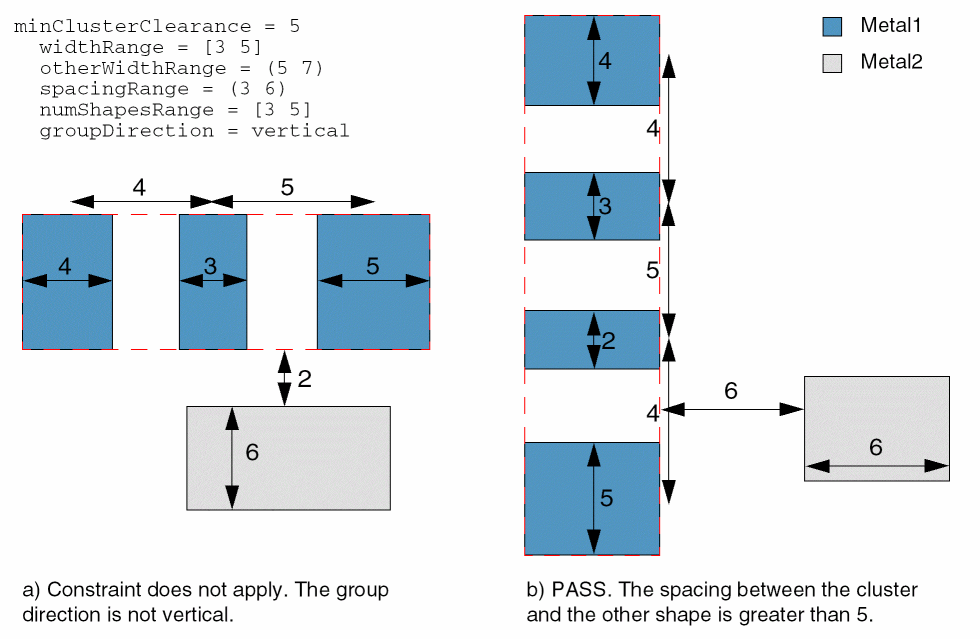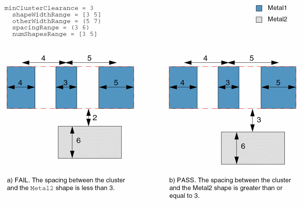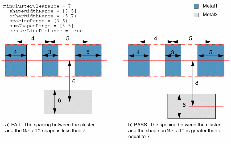 Metal2is greater than 5 and less than 7. - The centerline spacing between the shapes in the cluster is greater than 3 and less than 6.