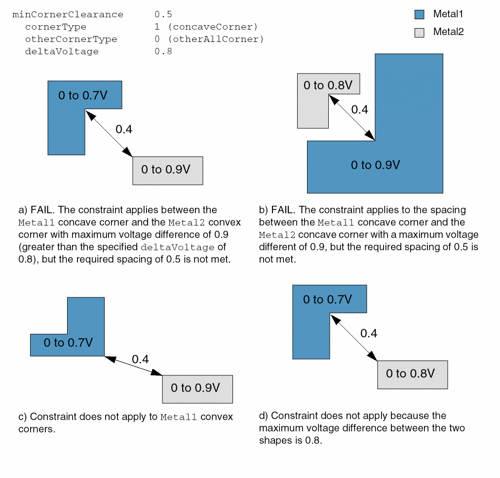 Sets a minimum spacing requirement of 0.5 user units between concave corners on Metal1 and all corners on Metal2 provided the maximum voltage difference between the shapes exceeds 0.8V.
