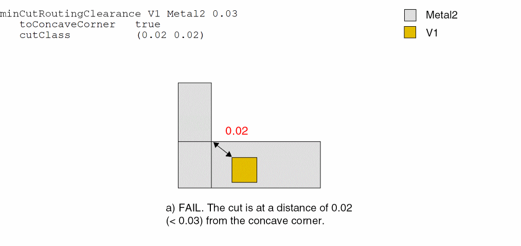 Sets the minimum clearance between 0.02 x 0.02 V1 cuts and Metal2 shapes to 0.03 user units. The spacing between 0.02 x 0.02 V1 cuts and concave corners of enclosing Metal2 shapes must be greater than or equal to 0.03 user units.
