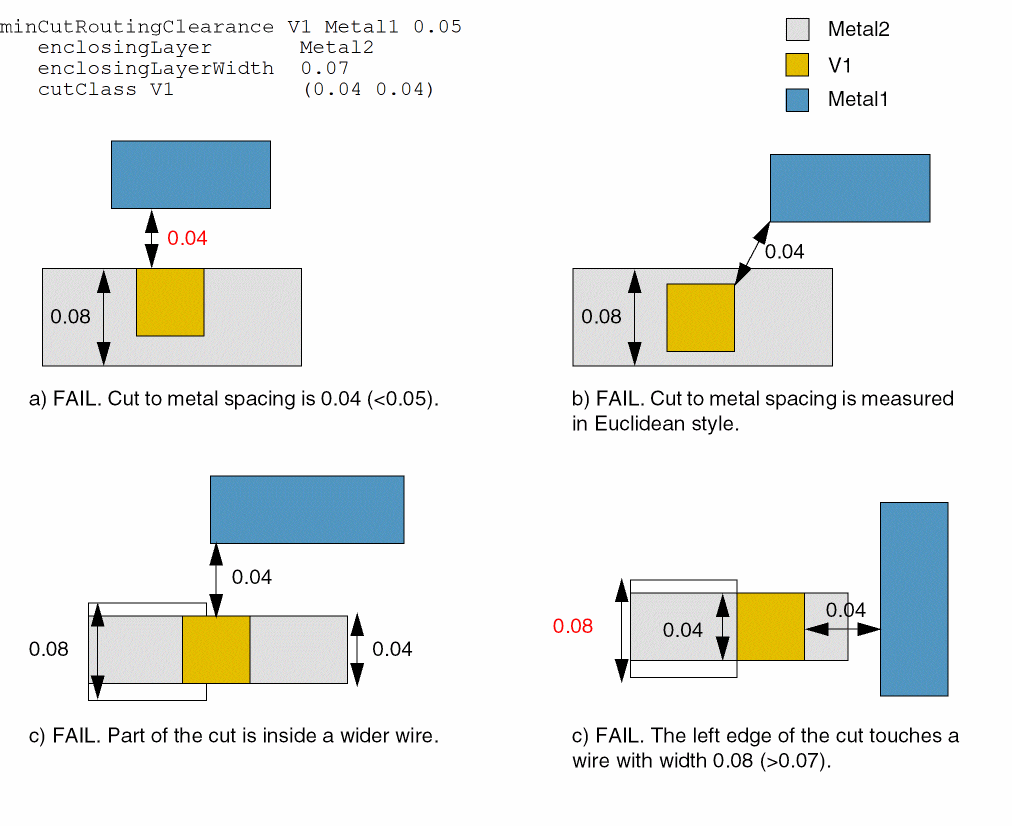 Specifies the minimum clearance between specific cut classes and metal shapes. For rectangular cut classes, the clearance can optionally be enforced only between the short ends of the cut and metal shapes. Additionally, the clearance can optionally be between a cut shape and the concave corner of the wire that contains the cut.