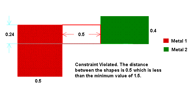In this example, the minimum clearance between Metal1 and Metal2 shapes must be greater than or equal to 1.5µm under the following conditions: