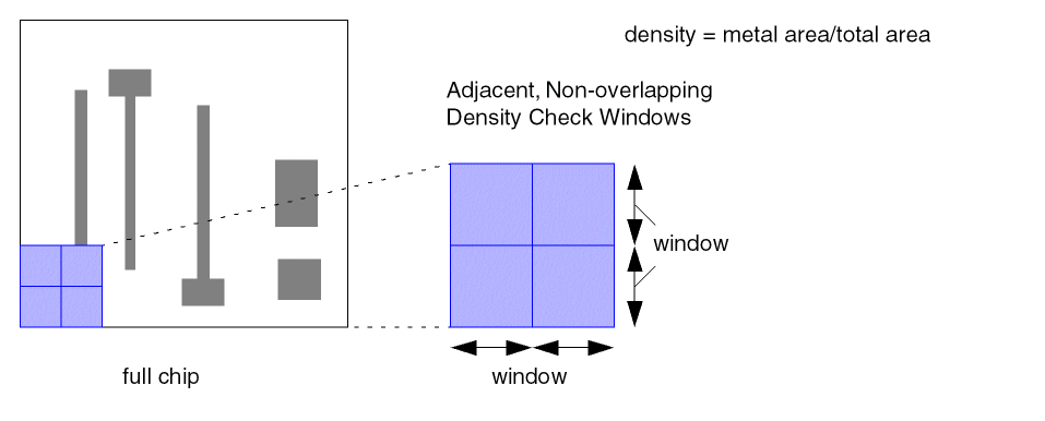 Density checking starts with the check window in a corner of the design, then the check window is moved across the design incrementally, by step size, and the density is checked at each step.