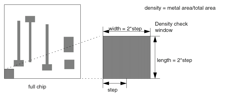 Density checking starts with the check window in a corner of the design, then the check window is moved across the design incrementally, by step size, each time validating that the density percentage in the check window is greater than or equal to the minimum allowed percentage.