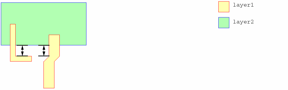 Sets the minimum extension of a shape on layer1 over a shape on layer2, as measured from the facing edge of layer2 to an inside corner on the layer1 shape. The minimum inside corner extension applies to an inside corner created by a geometry at any angle, diagonal or 90 degrees.
