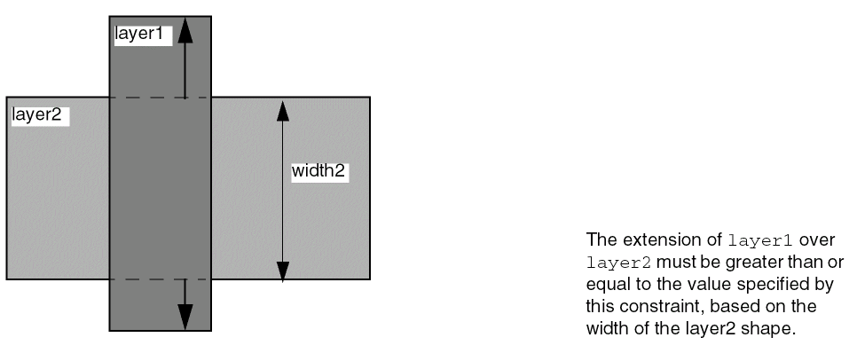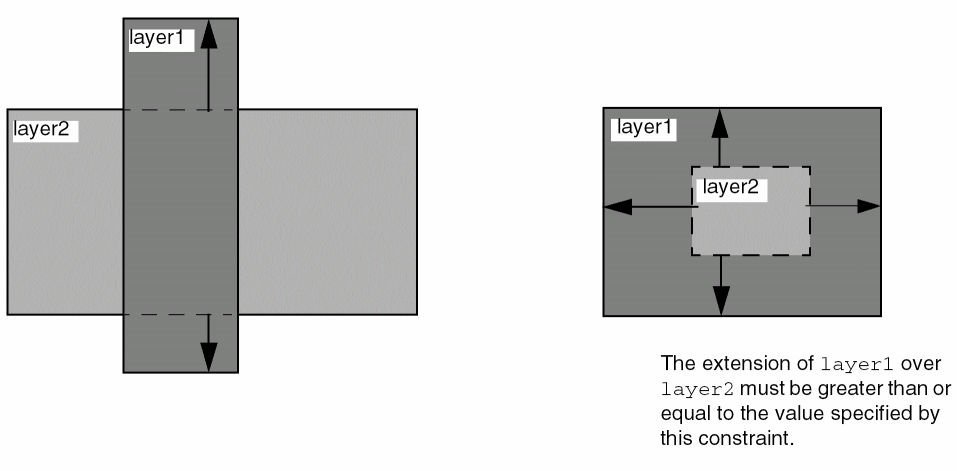 Specifies the minimum distance a shape on layer1 must extend past a shape on layer2. Extensions are specified from the outside edge of the shape on the second layer to the inside edge of the shape on the first layer. This constraint definition is not symmetric, implying that the minimum extension of layer1 past layer2 is not the same as the minimum extension of layer2 past layer1. The constraint applies only if parallel run length between the shapes is greater than zero.