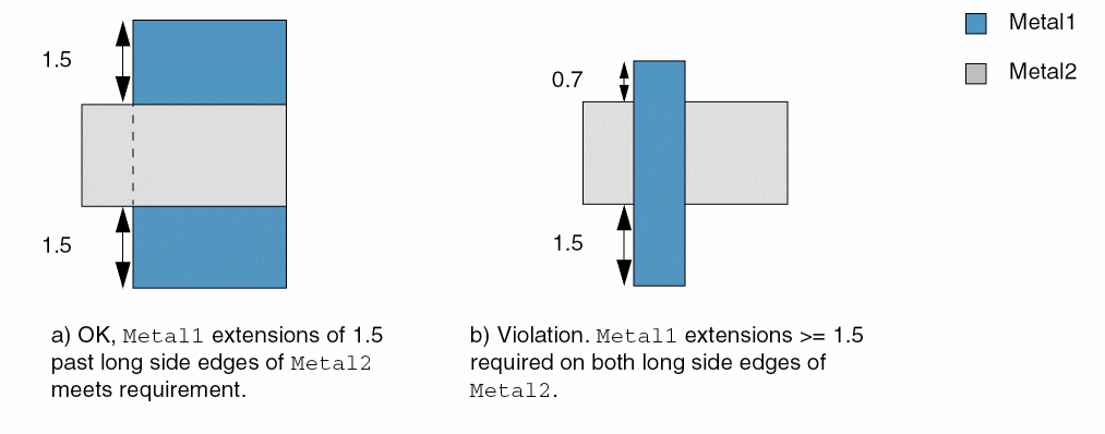The following example specifies that Metal1 shapes must extend at least 0.15 past the long side edge of Metal2 shapes.