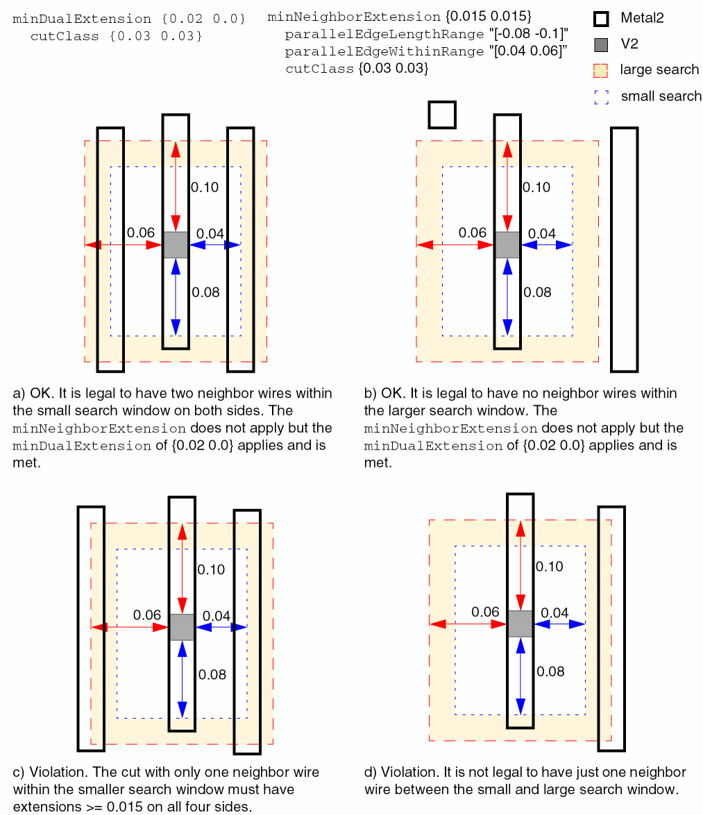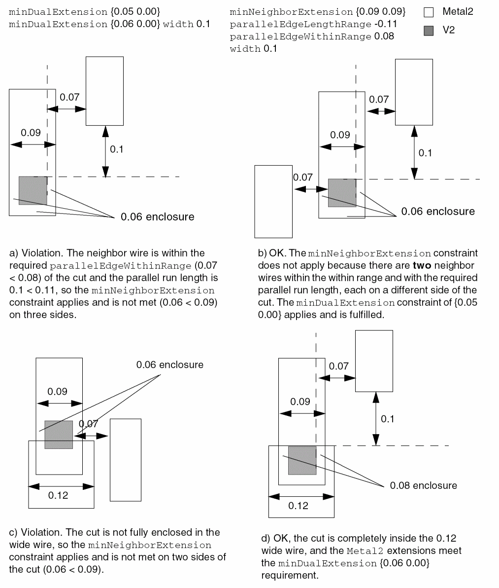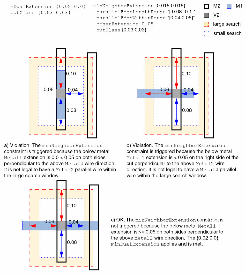 Also, the extensions required for wide wires are usually larger, but the minNeighborExtension can be even larger. Unless a cut is completely inside a wide wire, the minNeighborExtension constraint should also be checked. The minNeighborExtension constraint can optionally apply only when the layer1 wire containing the layer2 cut is less than a given width (maxWidth).