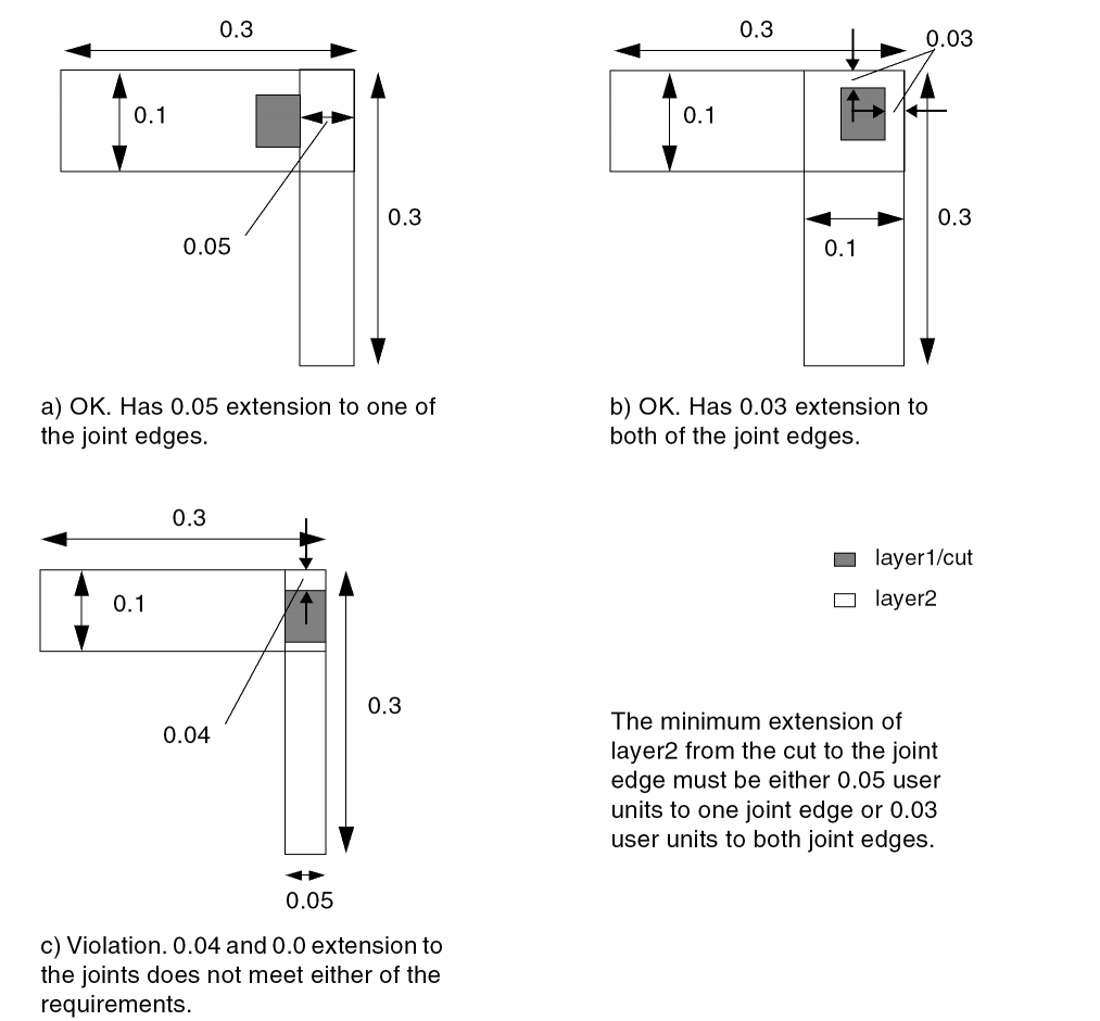 Some processes require an extension for joint edges that is different from the extension to other edges. The minViaJointExtension constraint specifies the minimum extension from a cut on layer1 to two consecutive layer2 joint edges, and can optionally apply to a specific cut class.