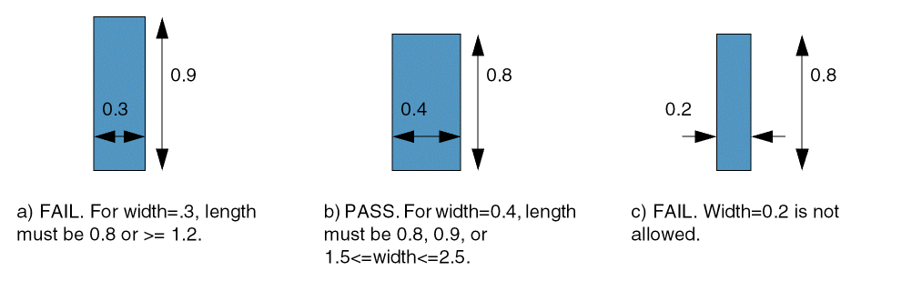 Permits three Metal1 length ranges (0.1, 0.2, and >=0.35).