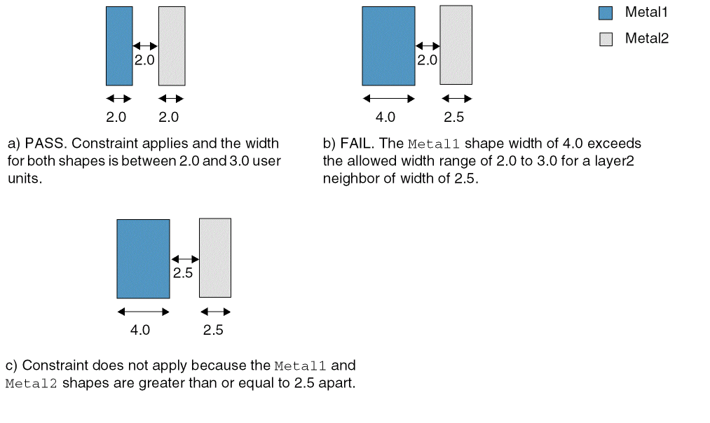Metal1shape must be greater than or equal to2.0and less than or equal to3.0user units in width when it is within 2.5 user units of aMetal2shape that is greater than or equal to 2.5 user units in width. -