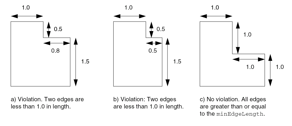 Using these settings for minEdgeLength and lengthSum, shapes b and c in the following figure are legal. For shape b, the consecutive edges that are shorter than minEdgeLength have a total length of 1.0, which is less than the lengthSum value, so the constraint is not applied. Shape a is a violation because the total length of the consecutive minimum length edges is greater than the lengthSum value.