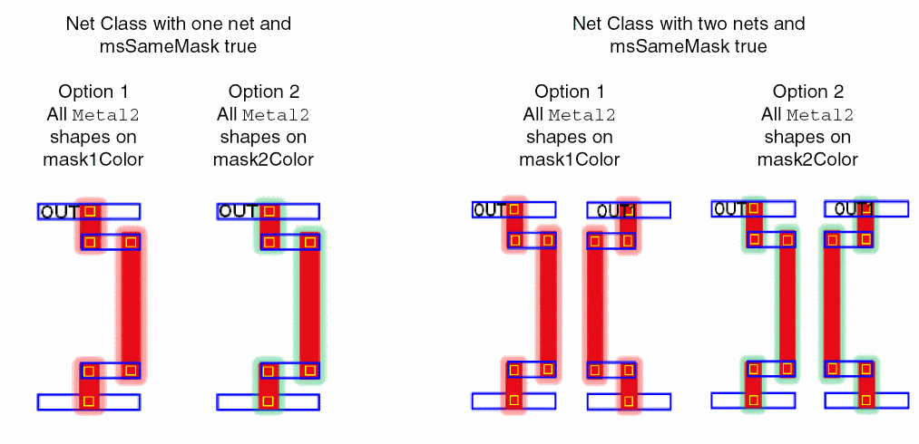 The following figure illustrates how shapes on a layer are assigned to the same mask (same color group) when msSameMask is true for a net or net class.