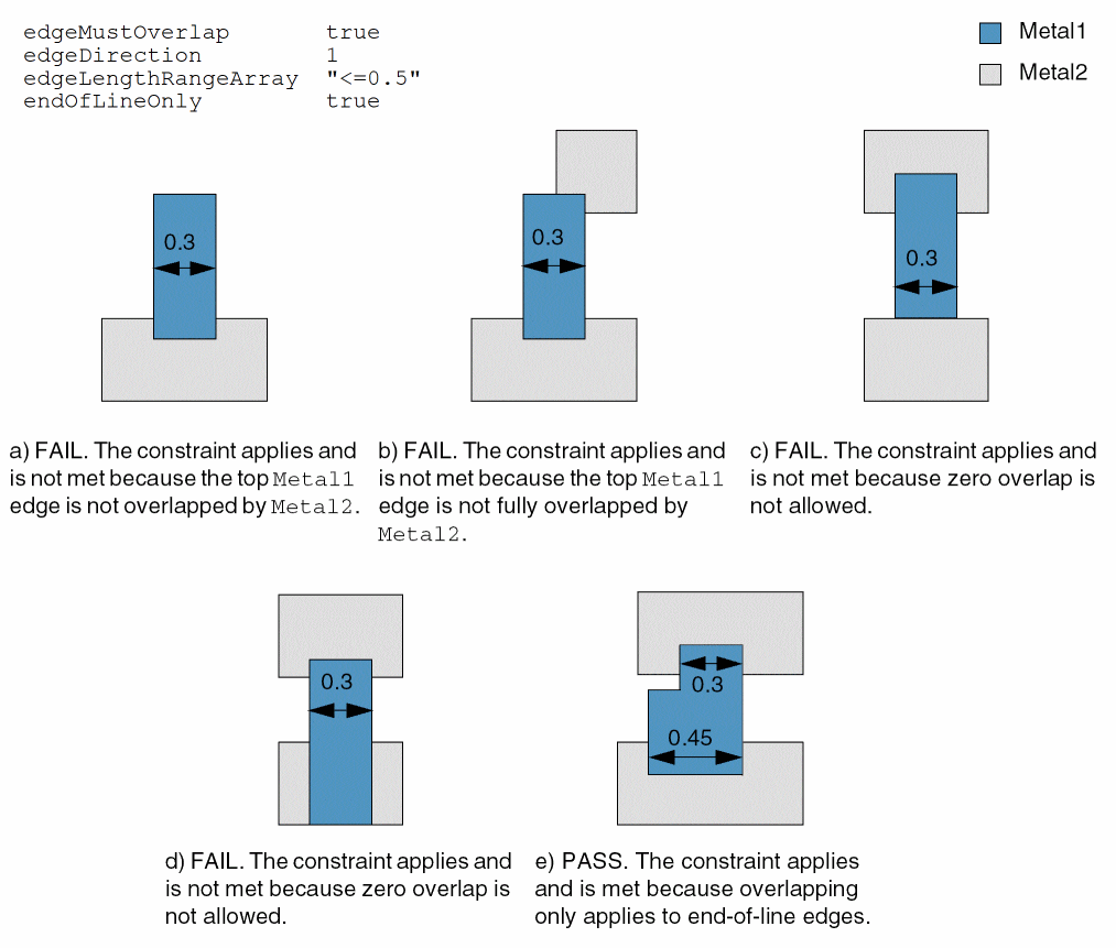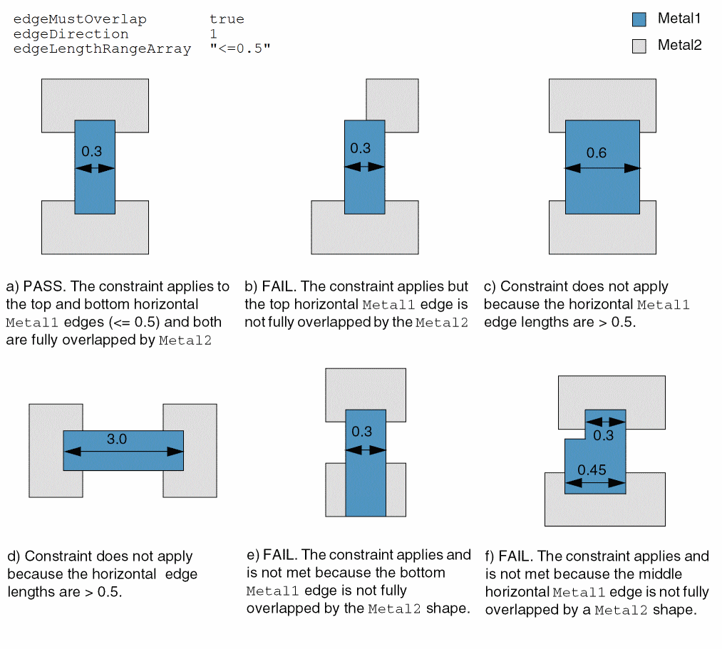 Specifies that all horizontal edges on layer Metal1 that are less than or equal to 0.5 user units in length must be fully overlapped by a shape on layer Metal2.