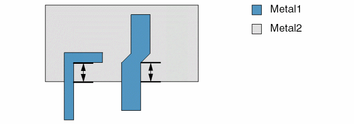 Specifies the minimum overlap from the inside corner of a shape on layer1 to the edge of the enclosing shape on layer2. ![]() |