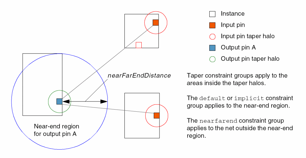 The minimum distance between each output pin and its farthest input pin is calculated and the minimum of these is the radius of the net. The nearFarEndDistance is calculated by multiplying the nearFarPercentage by the radius, then dividing by 100. The default or implicit constraint group applies to the routing within nearFarEndDistance of each output pin (near-end region) and the nearfarend constraint group applies to the net outside the near-end region.