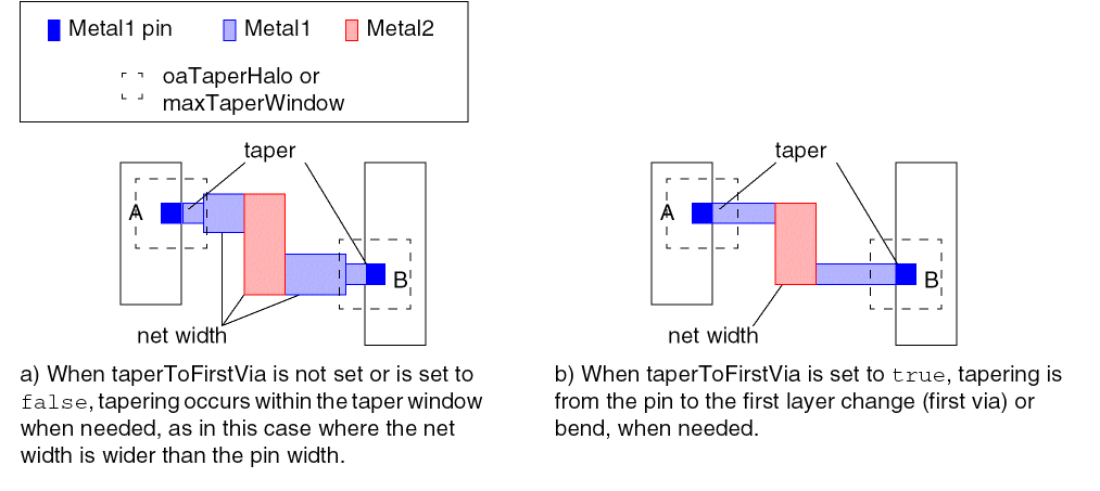 Specifies whether the taper window is from the instance pins to the first layer change (first via) or bend. When this constraint is not set or is set to false, the taper window is determined by the settings of oaTaperHalo, maxTaperWindow, and minTaperWindow, as specified in Using Tapers.