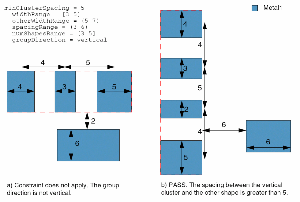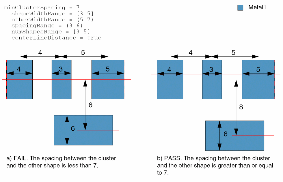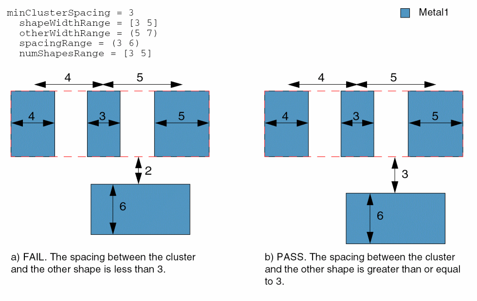 Specifies that the minimum spacing between the cluster and the other shape must be greater than or equal to 5user units under the following conditions: