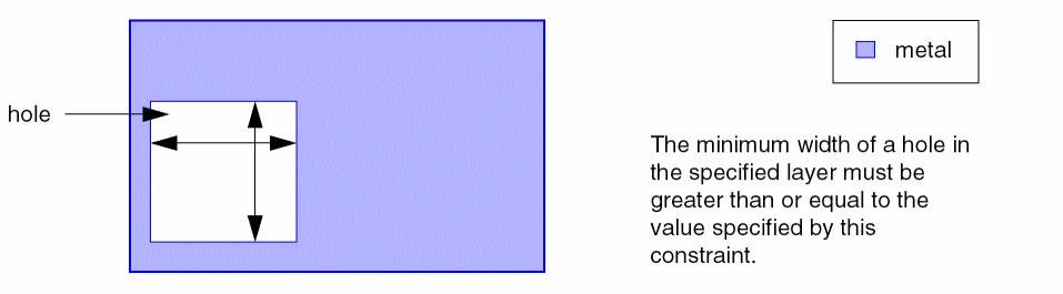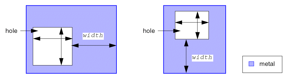 Specifies the minimum width, parallel edge-to-edge, in the X and Y directions for a hole on the layer, based on the width of the enclosing metal. The lookup key (width) for the table is the largest effective width of the enclosing metal, measured from the edge of the hole. The table value is the minimum width for the hole.