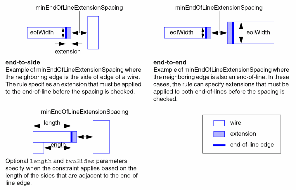 Specifies the minimum spacing between an end-of-line edge of a given width and neighboring wire edges when a specified extension must be applied to the end-of-line before the spacing is checked.The constraint can also specify an extension that must be applied to the neighbor wire, when the neighbor wire is an end-of-line of a given width, before spacing is checked. You can use optional parameters to specify when the constraint does not apply, based on the length of the sides of the wire adjacent to the end-of-line edge.